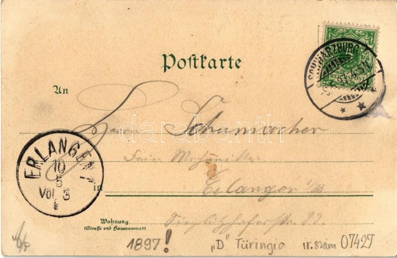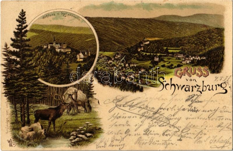 Leírás: 1897 (Vorläufer!) Schwarzburg, Schloss v. Helenensitz / castle, general view, deer. Verlag v. Albert Jahn. O.Z.M. Art Nouveau, floral, litho