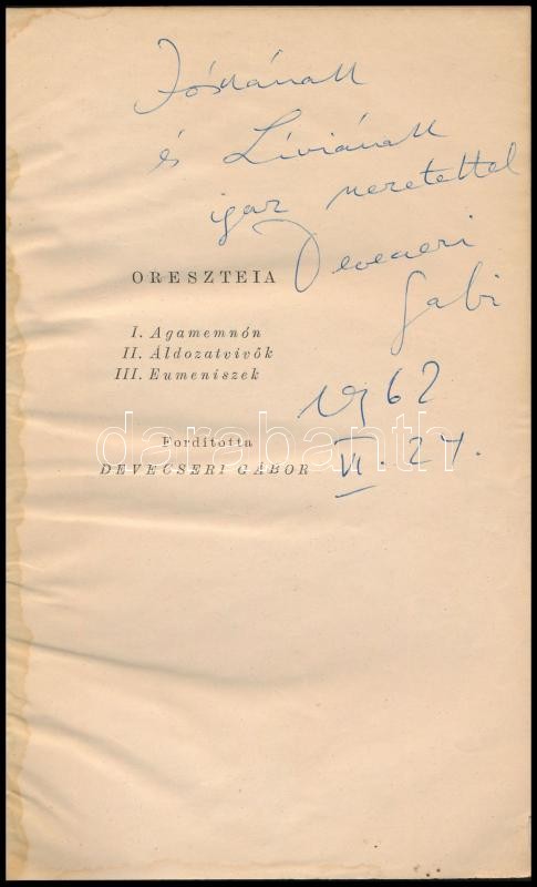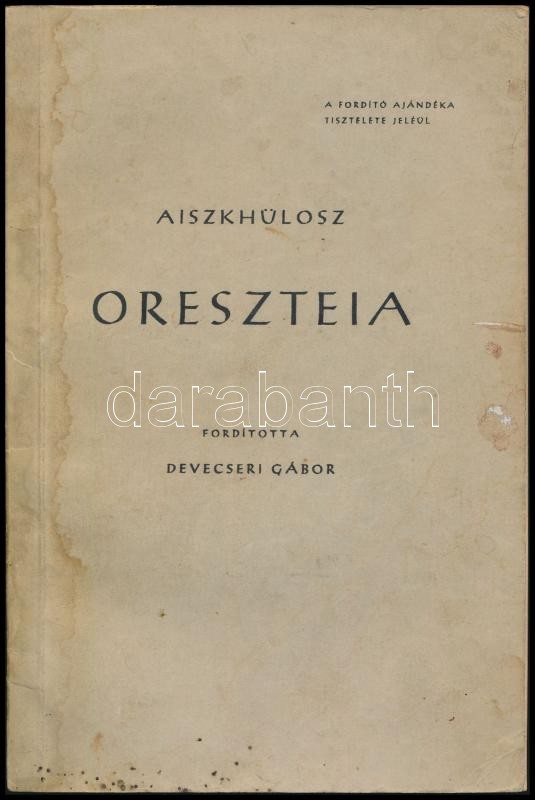 Aiszkhülosz: Oreszteia. I. Agamemnón. II. Áldozativók. III. Eumeniszek. Ford.: Devecseri Gábor. (Bp.,1962., Európa), 4+153-275 p. Különlenyomat az Aiszkhülosz drámái c. kötetből. Kiadói papírkötés, "A fordító ajándéka tisztelete jeléül", foltos. A fordító által dedikált.