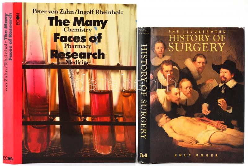 Knut Haeger: The illustrated history of surgery. New York,1988,Bell. Angol nyelven. Kiadói egészvászon-kötés, kiadói papír védőborítóban.+Peter von Zahn-Ingolf Rheinholz: The Many Faces of Research. Chemistry, pharmacy, medicine. Düsseldorf-Vienne,1980,Econ. Angol nyelven. Kiadói egészvászon-kötés, kiadói papír védőborítóban.