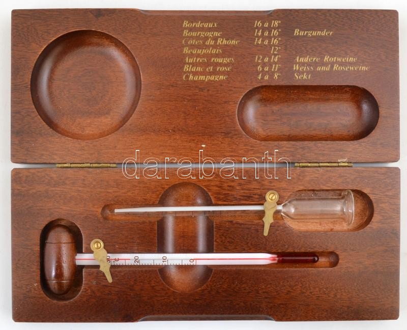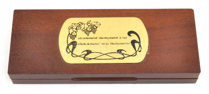 Leírás: 1 db fokoló + 1 db hőmérő, egyik sérült, h: 12 és 14 cm, fa dobozban
