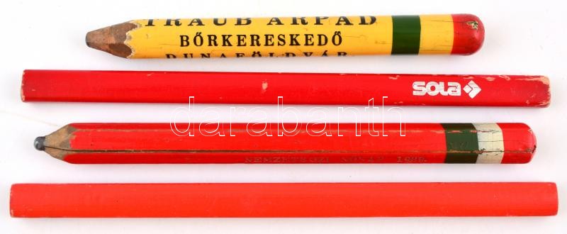 Leírás: 4 db régebbi ceruza: 2 db használatlan ács ceruza. 1 db nemzetközi nőnap 1969 felirattal. 1 db Traub Árpád bőrkereskedő Dunaföldvár felirattal.