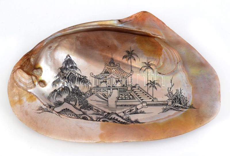 Leírás: Festett kagyló, hátoldalára rombuszalakú fadarab ragasztva, h: 17,5 cm