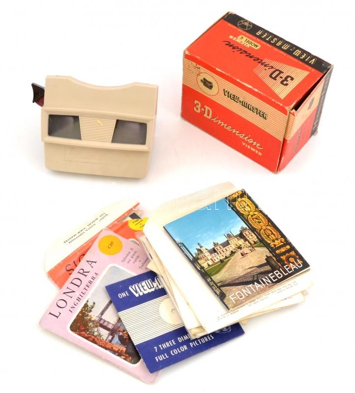Retró View-Master Model E 3D, belga gyártmányú néző, eredeti karton dobozában. Hozzá tartozik ca. 30 kép, különféle témákban: Brüsszel, Amerikai űrutazás, Olaszország, London stb.
