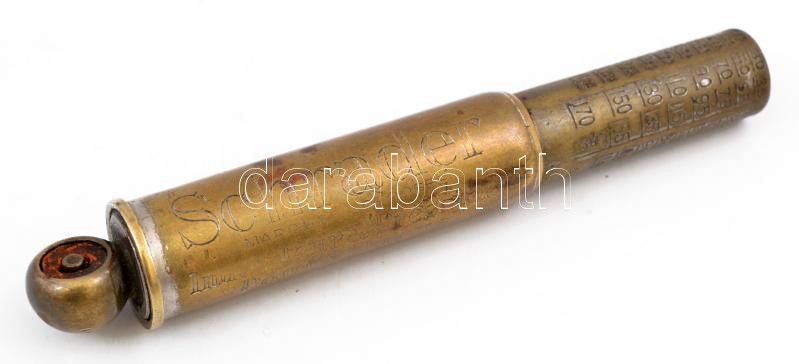 Leírás: cca 1910 Schrader márkájú Franciaországba importált autókerék nyomásmérő, "Schrader, marques deposeeé (...) fabriqué par A. Schrader's Son Inc.Londres Angelterre - Toronto Canada - N.X. Ettas Unis" felirattal, kopott, h: 8 cm