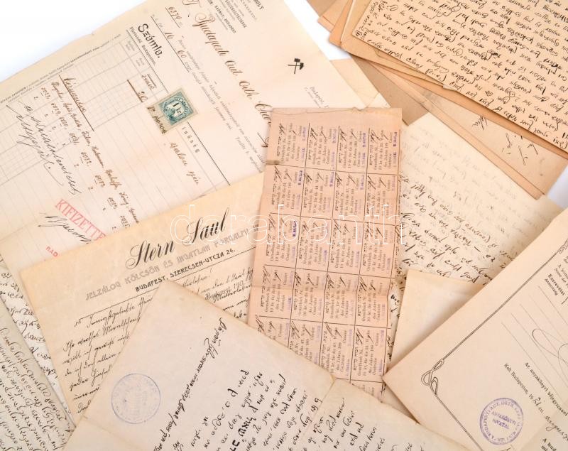 cca 1896-1941 Vegyes judaikai vonatkozású tétel, közte levél, okmány, számla, Laskasütöde-műhely metszet rajzz a Budapesti Auth. Orth. Izr. Hitközség részére,...stb., egy más jellegű számlával. Változó állapotban, néhány okmányon kivágással.