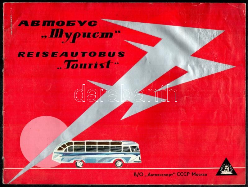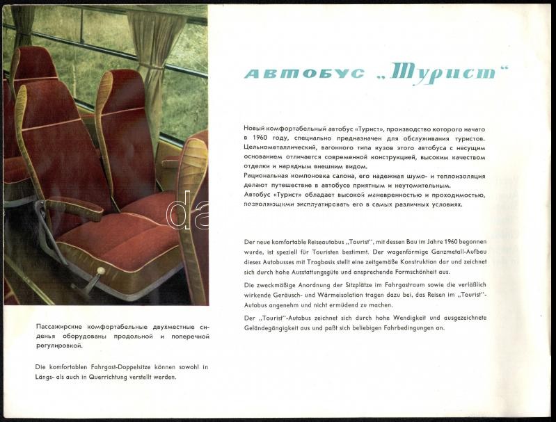 cca 1960 Reiseautobus Tourist, német nyelvű autóbusz ismertető, a hátsó borító és az utolsó lap sérült és a szélük egy része az az utolsó előtti laphoz ragadt, foltos, hullámos lapokkal.