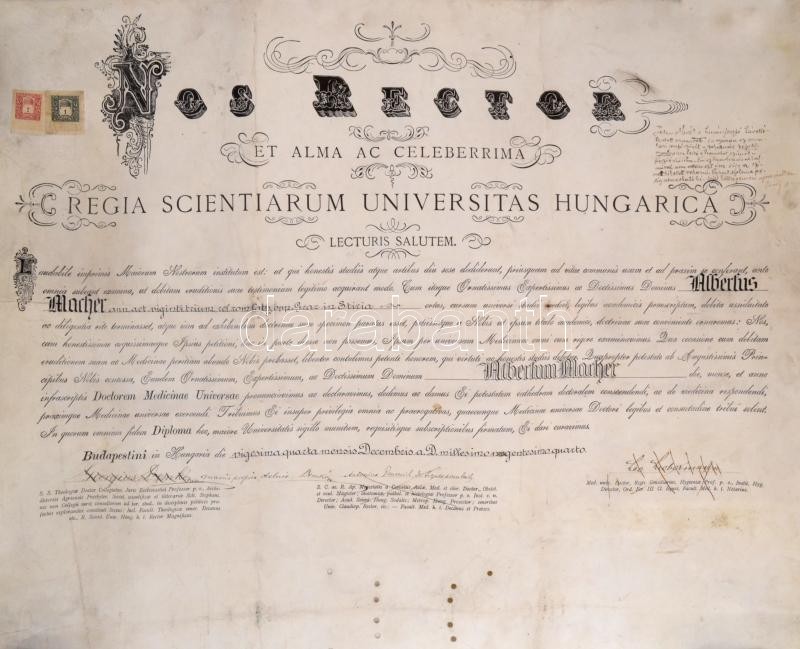 1904 Orvosi diploma, díszes oklevél, Budapest, 2 korona és 1 korona ok... https://www.darabanth.com/hu/366-Gyorsarveres/366.0/Mutargy-papirregiseg-egyeb/Okmanyok~500017/1904-Orvosi-diploma-diszes-oklevel-Budapest-2-korona-es-1-korona-okmanybelyeggel~II2123430