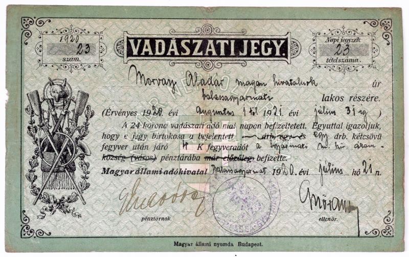 1920 Balassagyarmat, vadászati jegy, hajtott https://www.darabanth.com/hu/366-Gyorsarveres/366.0/Mutargy-papirregiseg-egyeb/Okmanyok~500017/1920-Balassagyarmat-vadaszati-jegy-hajtott~II2123630
