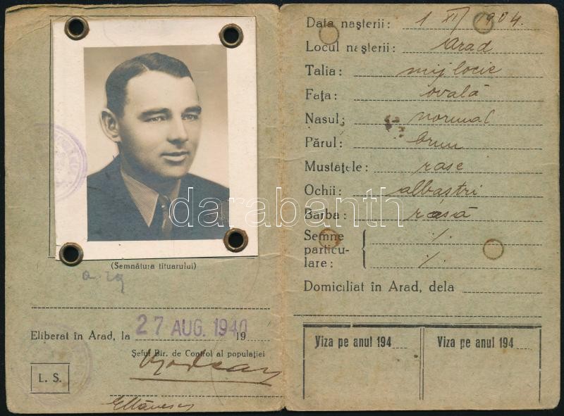 1940 Fényképes román személyazonossági igazolvány, aradi születésű sze... https://www.darabanth.com/hu/366-Gyorsarveres/366.0/Mutargy-papirregiseg-egyeb/Okmanyok~500017/1940-Fenykepes-roman-szemelyazonossagi-igazolvany-aradi-szuletesu-szemely-reszere-m-k~II2117871
