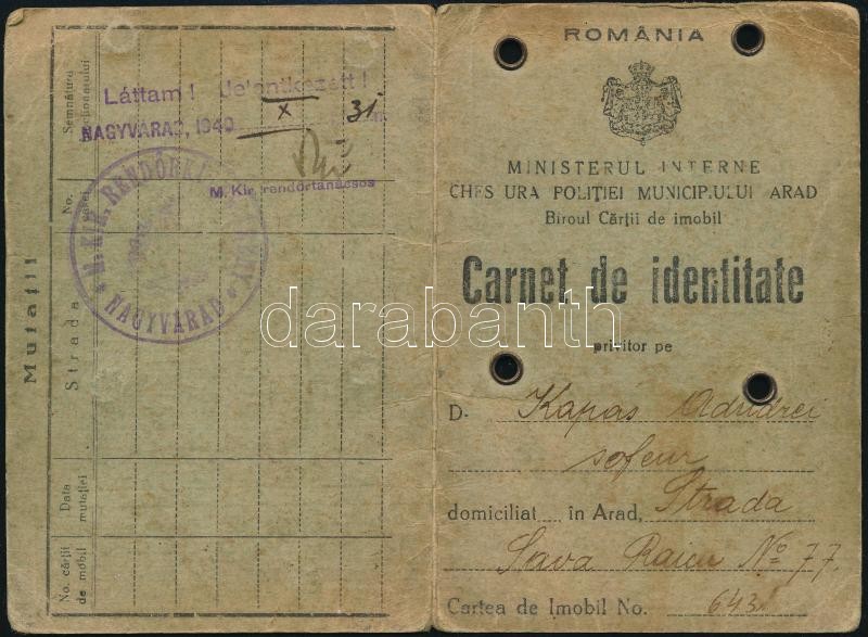Leírás: 1940 Fényképes román személyazonossági igazolvány, aradi születésű személy részére, m. kir. rendőrségi bélyegzéssel, Nagyváradról, 1940. X. 21.