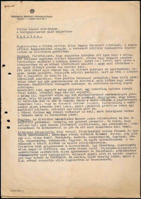 Leírás: 1963 Bp., Afrikai vadászatról készített feljegyzés Földes László belügyminiszter-helyettes részére