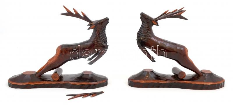 Leírás: 2 db faragott fa szarvas pár, egyik törött aganccsal 21x27 cm