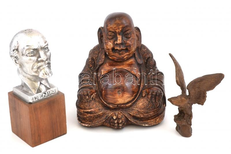 Vegyes kisplasztika tétel: 1 db Lenin arckép felirattal, fém, fa talapzaton, jelzés nélkül, m: 20 cm. 1 db ülő Buddha, mázas kerámia, több kisebb sérüléssel, jelzés nélkül, m: 20 cm. 1 db sas kisplasztika, bronz, jelzés nélkül, m: 13 cm