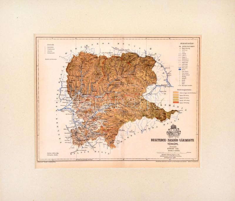 Leírás: 1893 Beszterce-Naszód vármegye térképe,1:470.000, tervezte: Gönczy Pál, Pallas Nagy Lexikona, Bp., Posner, paszpartuban, 23x28 cm