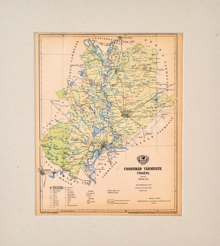 Leírás: 1893 Csongrád vármegye térképe,1:370.000, tervezte: Gönczy Pál, Pallas Nagy Lexikona, Bp., Posner, paszpartuban, 28x23 cm
