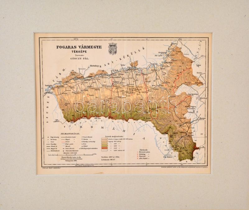 Leírás: 1894 Fogaras vármegye térképe,1:350.000, tervezte: Gönczy Pál, Pallas Nagy Lexikona, Bp., Posner, paszpartuban, 23x28 cm