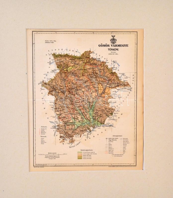 Leírás: 1894 Gömör vármegye térképe,1:500.000, tervezte: Gönczy Pál, Pallas Nagy Lexikona, Bp., Posner, paszpartuban, 28x23 cm
