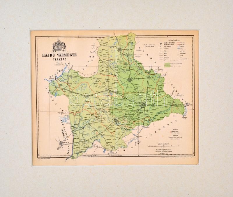 Leírás: 1894 Hajdu vármegye térképe,1:370.000, tervezte: Gönczy Pál, Pallas Nagy Lexikona, Bp., Posner, paszpartuban, 23x28 cm