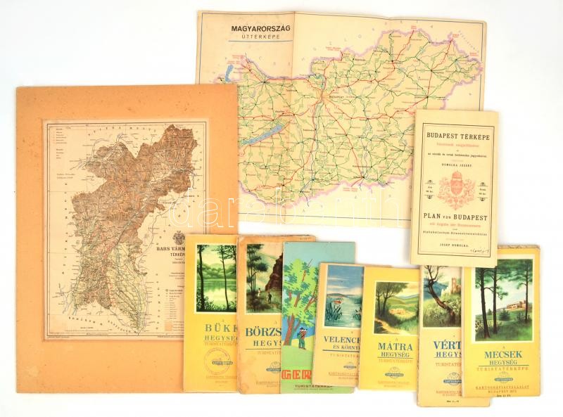 Vegyes térkép tétel, 10 db, közte Bars vármegye térképe, Pallas, Bp., Posner, paszpartuban, kis szakadással, gyűrődéssel, 29x23 cm +1983 Homolka József: Budapest térképe, 1896-os kiadás reprintje, Bp., 1983, Kartográfiai Vállalat, 67×57 cm, valamint 7 db modern turista térkép, és 1 db Magyarország térkép.
