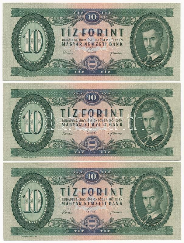 1962. 10Ft (3x) sorszámkövetők T:II- Adamo F6 https://www.darabanth.com/hu/366-Gyorsarveres/366.0/Numizmatika/Magyar-bankjegyek~2000007/1962-10Ft-3x-sorszamkovetok-TII-Adamo-F6~II2123540