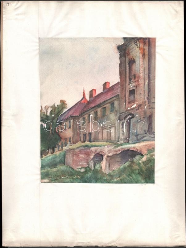 Leírás: Sostarics Lajos (1896-1968): Kiscelli kastély. Akvarell, papír, jelzés nélkül, kartonra ragasztva, 23,5×18,5 cm