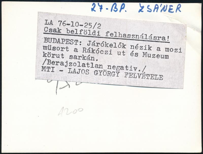 Leírás: Járókelők nézik a moziműsort az utcán, feliratozott sajtófotó, felületén törésnyom, 11,5×8,5 cm