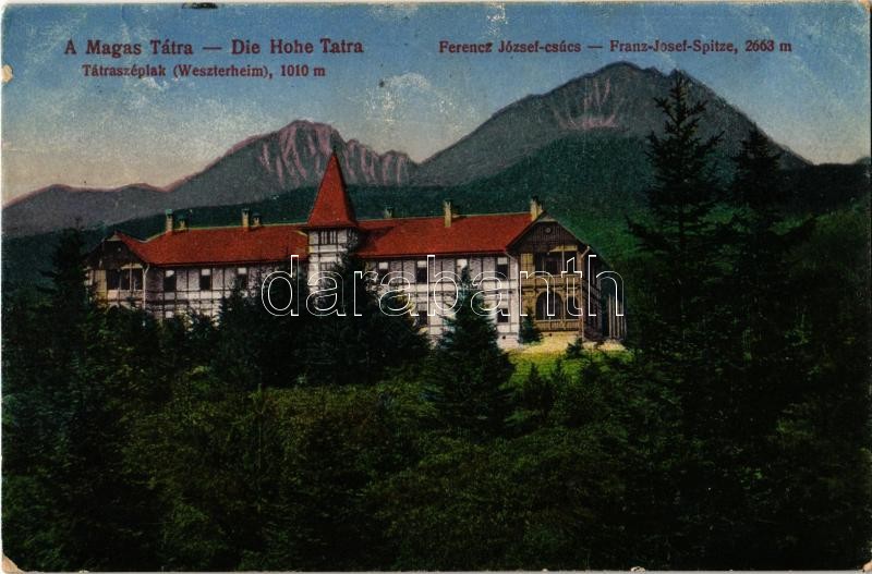 Leírás: 1918 Tátraszéplak, Tatranska Polianka, Westerheim (Magas-Tátra, Vysoké Tatry); Tivoli villa, Ferenc József-csúcs / Franz-Josef-Spitze / Stít Frantiska Jozefa (Gerlachovsky stít) / villa, mountain peak (EK)