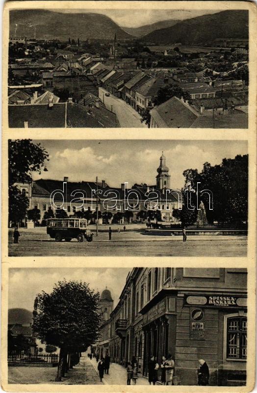 Leírás: 1938 Rozsnyó, Roznava; utca, busz, Schnitzer élő halak üzlete, bank / streets, autobus, Spisska Banka U.S., bank, shops (Rb)