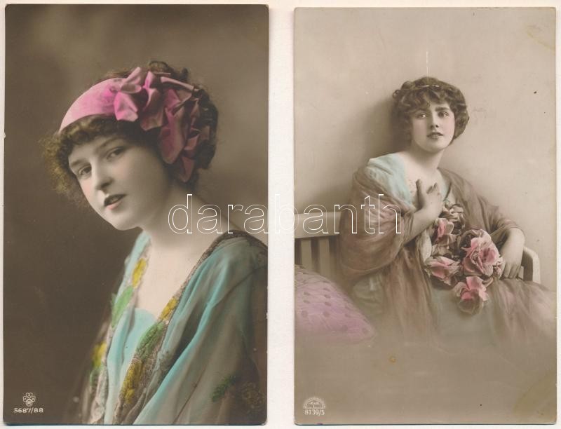 Leírás: 10 db RÉGI motívum képeslap tokban: romantikus hölgyek és párok / 10 pre-1945 motive postcards: romantic ladies and couples