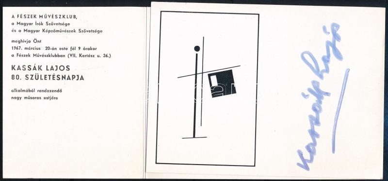 Leírás: 1967 Kassák Lajos 80 éves. Meghívó. A művész, Kassák Lajos (1887-1967) aláírásával.