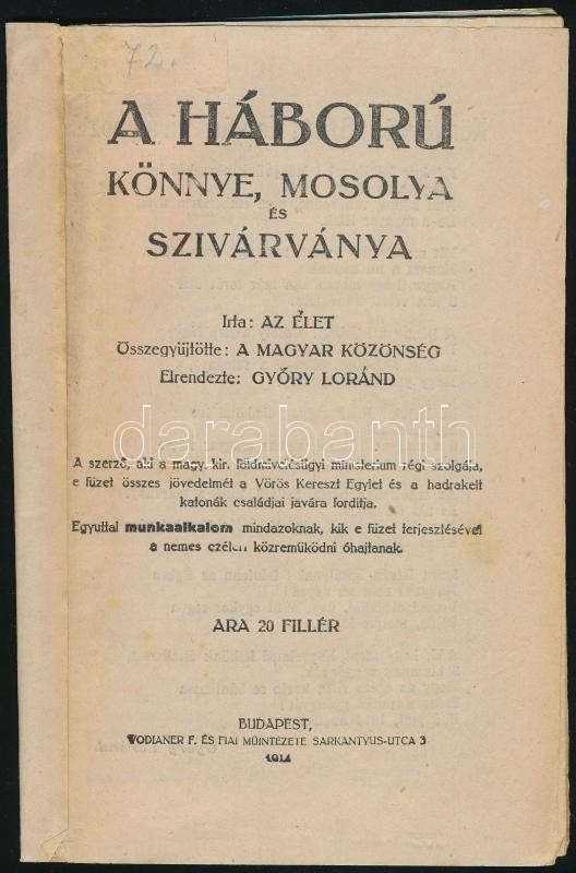 1914 Győry Lóránd szerk.: A háború könnye, mosolya és szivárványa. 30p... https://www.darabanth.com/hu/367-Gyorsarveres/367.0/Konyvek/Konyvek-Militaria-Katonasag~1500005/1914-Gyory-Lorand-szerk-A-haboru-konnye-mosolya-es-szivarvanya-30p-Kiadoi-papiborit~II2128936