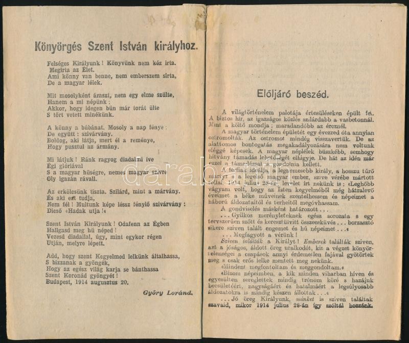 Leírás: 1914 Győry Lóránd szerk.: A háború könnye, mosolya és szivárványa. 30p. Kiadói papíborítékkal