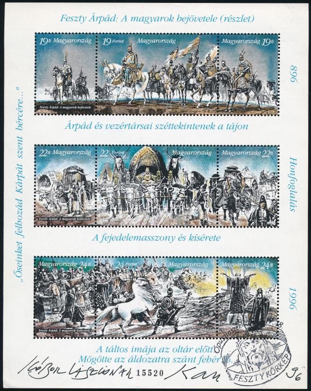 Leírás: 1996 Feszty körkép számozott, "Feszty Körkép Ópusztaszer 96.IV.18." pecséttel ellátott bélyeg blokkon Kass János dedikált aláírása: "Kóbor Lászlónak, Kass 96".