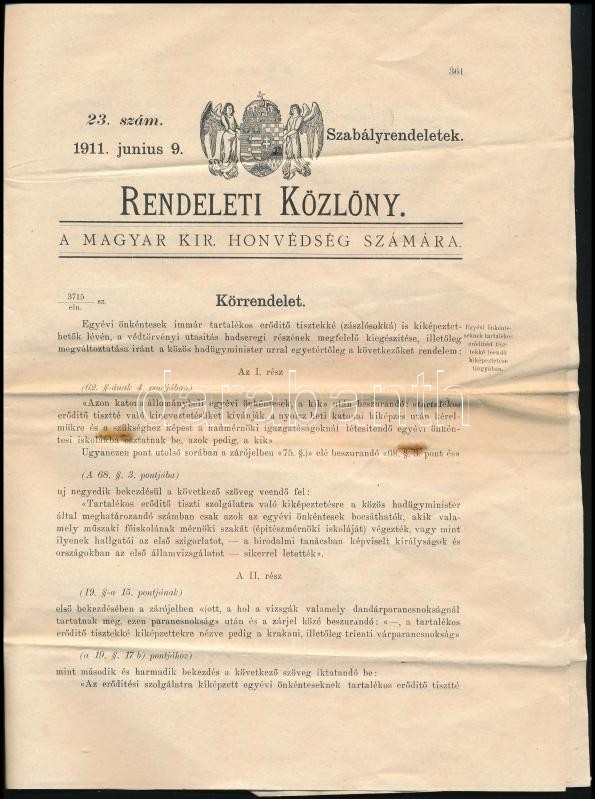 1911 Rendeleti közlöny a M. Kir. Honvédség számára. https://www.darabanth.com/hu/367-Gyorsarveres/367.0/Mutargy-papirregiseg-egyeb/Militaria~29/1911-Rendeleti-kozlony-a-M-Kir-Honvedseg-szamara~II2130094