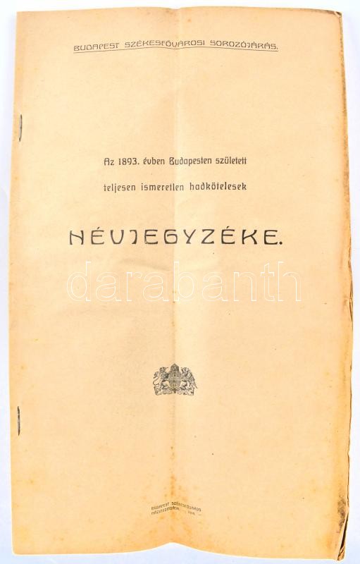 1914 Az 1893. évben Budapesten született, teljesen ismeretlen hadkötel... https://www.darabanth.com/hu/367-Gyorsarveres/367.0/Mutargy-papirregiseg-egyeb/Militaria~29/1914-Az-1893-evben-Budapesten-szuletett-teljesen-ismeretlen-hadkotelesek-nevjegyzeke-109p-H~II2130191
