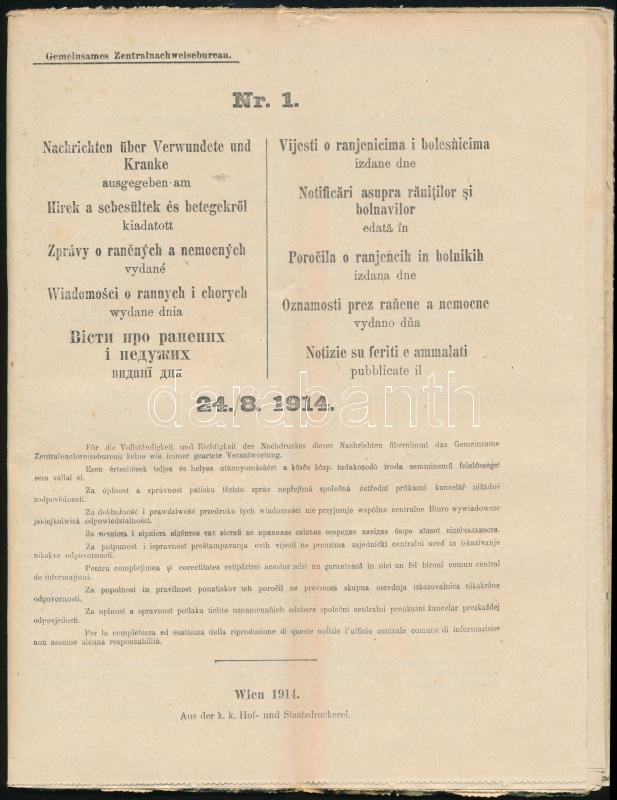 1914 Hírek a (világháborús) sebesültek és betegekről. Nr. 1. A monarch... https://www.darabanth.com/hu/367-Gyorsarveres/367.0/Mutargy-papirregiseg-egyeb/Militaria~29/1914-Hirek-a-vilaghaborus-sebesultek-es-betegekrol-Nr-1-A-monarchia-osszes-nyelven-N~II2128941