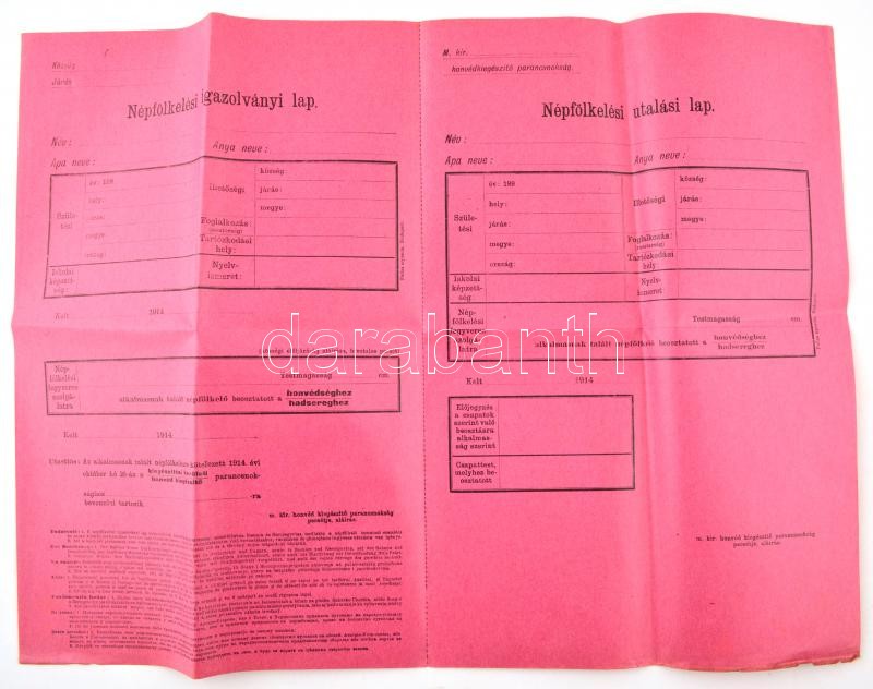 1914 Népfölkelési igazolási lap. Kitöltetlen. https://www.darabanth.com/hu/367-Gyorsarveres/367.0/Mutargy-papirregiseg-egyeb/Militaria~29/1914-Nepfolkelesi-igazolasi-lap-Kitoltetlen~II2128824