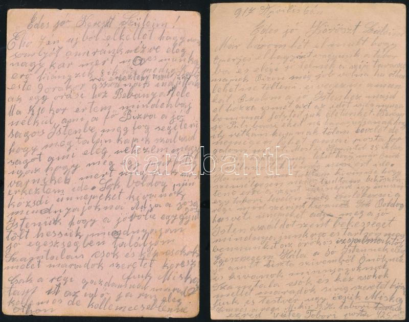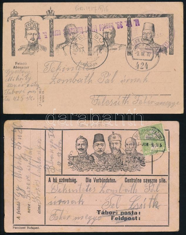 1916-1917 I. világháborúban harcoló honvéd tábori postái haza, 2 db, az egyiken "M. Kir. 39. tábori tarackos ezred" bélyegzéssel, a másikon Besztercebánya bélyegzéssel, "hű szövetség grafikával."