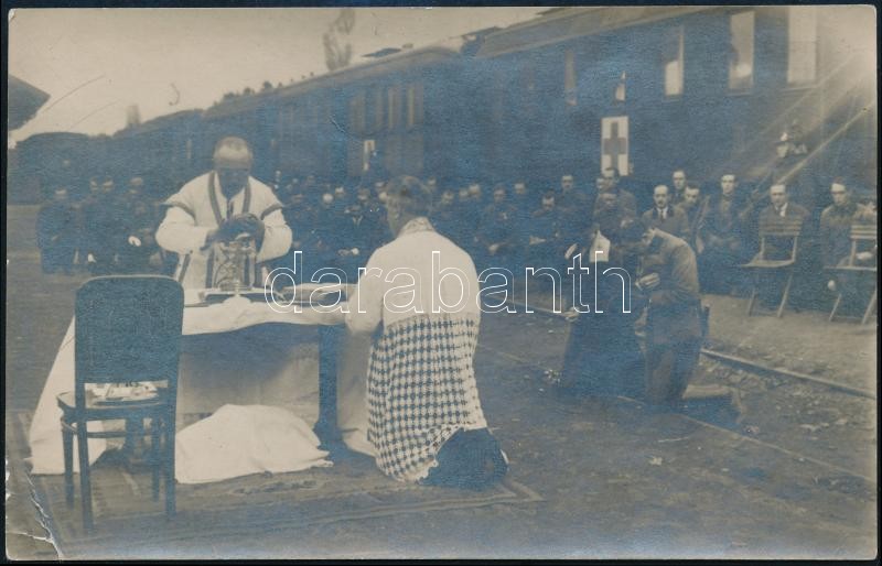 1921 Tábori mise celebrálása a biatorbágyi vasútállomáson IV. Károly király visszatérési kÃsérlete idején, az elÅ‘térben az oltár mellett IV. Károly király, és Zita királyné, a háttérben vöröskeresztes kórházvonat, fotólap, hátoldalán ceruzás jegyzettel, dátumozva, 8x13 cm