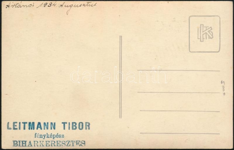 Leírás: 1934 Ártánd, katonai iskolás fiú fotója, fotólap, Biharkeresztes, Leitmann Tibor műterméből,14x9 cm
