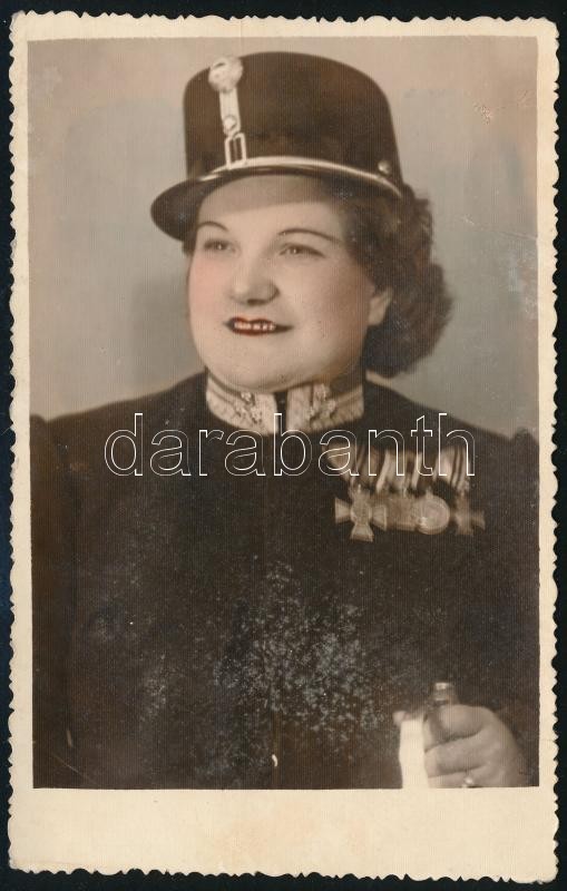 Leírás: 1939 Rendőrruhás hölgy portréja, kitüntetésekkel, karddal, fotólap, 13x8 cm