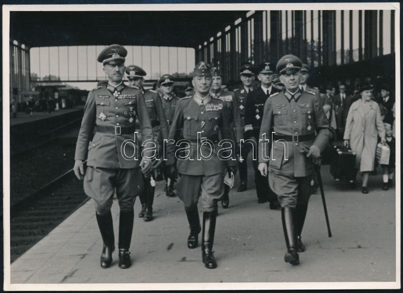 1943 Berlin, Csatay Lajos (1886-1944) vezérezredes, honvédelmi miniszter, Paul von Hase (1885-1944) Berlin katonai parancsnoka és Hermann Reinecke (1888-1973) (Chef des NS-Führungsstabes des OKW) német tábornokokkal, 1943.08.19., sajtófotó, a hátoldalán német nyelvű felirattal, Berlin, Transocean pecséttel, 13x18 cm/ 1943 Berlin, Csatay Lajos (1886-1944) Hungarian colonel general, Hungarian Minister of Defense, with German Generals, Paul von Hase (1885-1944) City commandant of Berlin and Hermann Reinecke (1888-1973) (Chef des NS-Führungsstabes des OKW), photo, with stamp and wirtings on the back, 13x18 cm