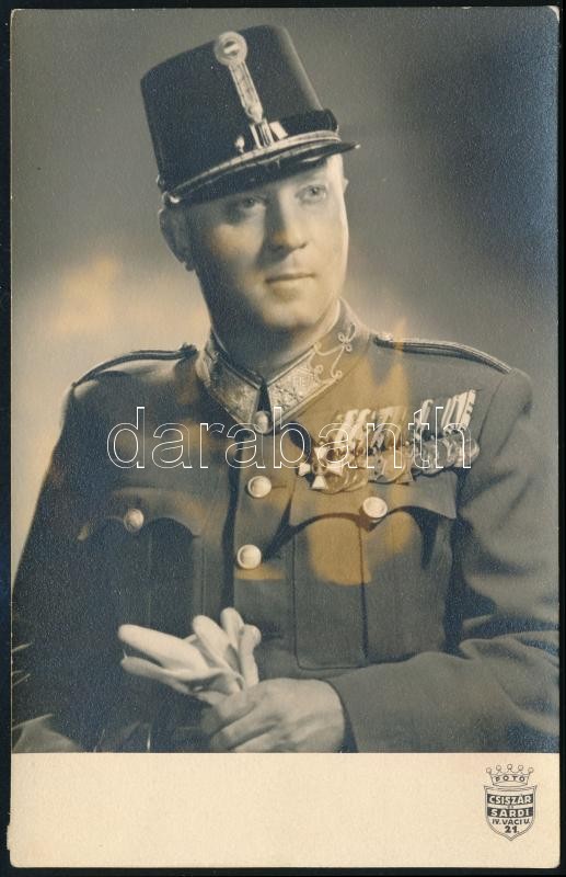 1943 Dr. Erdélyi Gyula ezredes fotója, kitüntetésekkel, a hátoldalán a "Muckájának" szóló ajándékozási sorokkal, verssel, Csiszár és Sárdi Fotó, a felületén elhívásból adódó folttal, 13x8 cm