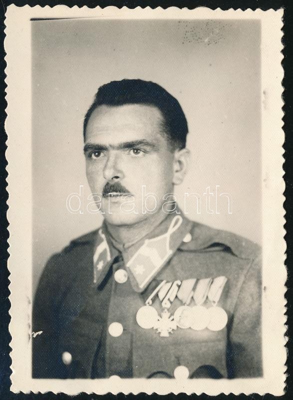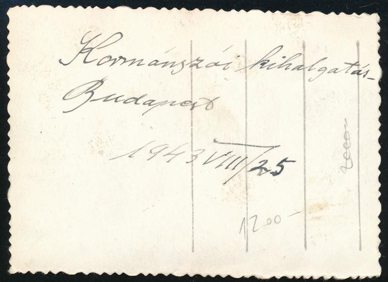 Leírás: 1943 Frontkatona fotója, kitüntetésekkel (vitézségi érmek, tűzkereszt), "Kormányzói kihallgatás, Bp., 1943 VIII. 25." bejegyzéssel a hátoldalán, 8x6 cm