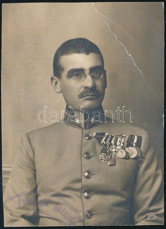 Leírás: cca 1914-1918 I. világháborús katonatiszt portréfotója, vaskorona renddel, Lipót-renddel, és más kitüntetésekkel, törésnyommal az egyik sarkán, 8x6 cm