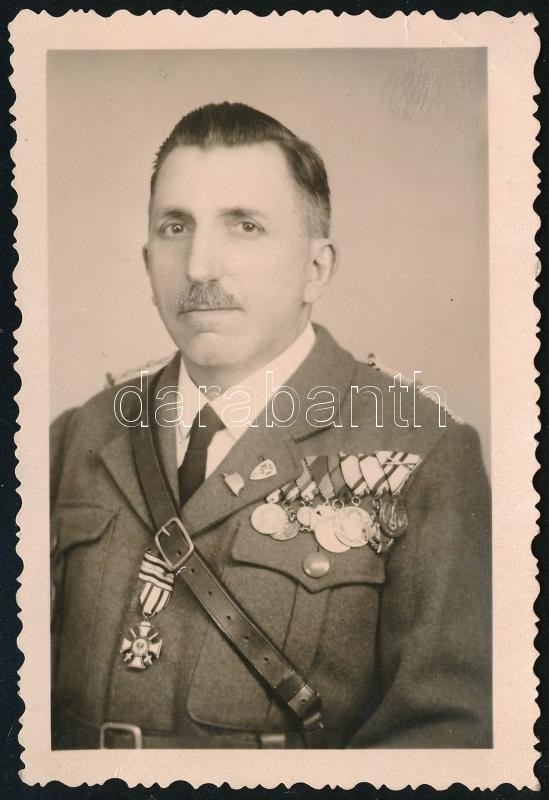 Leírás: cca 1920-1940 Frontharcos katona fényképe, számos kitüntetéssel, jelvényekkel, fotó, 8x5 cm