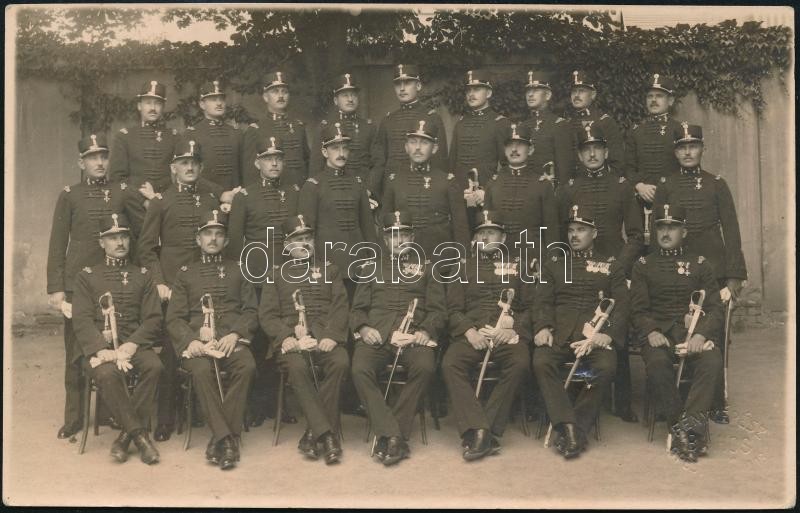 Leírás: cca 1920 Testőrségi altisztek csoportképe, kitüntetésekkel, kardokkal, fotólap, Bp., Blahos R(udolf) fényképészeti műterme, 13x8 cm
