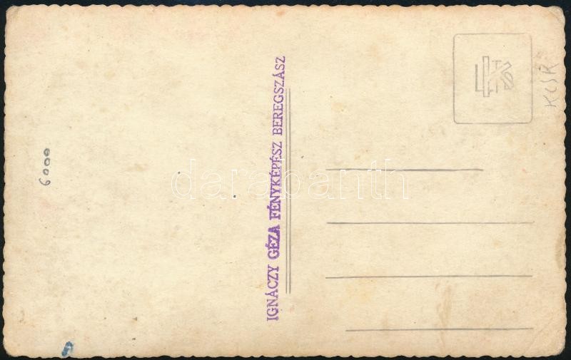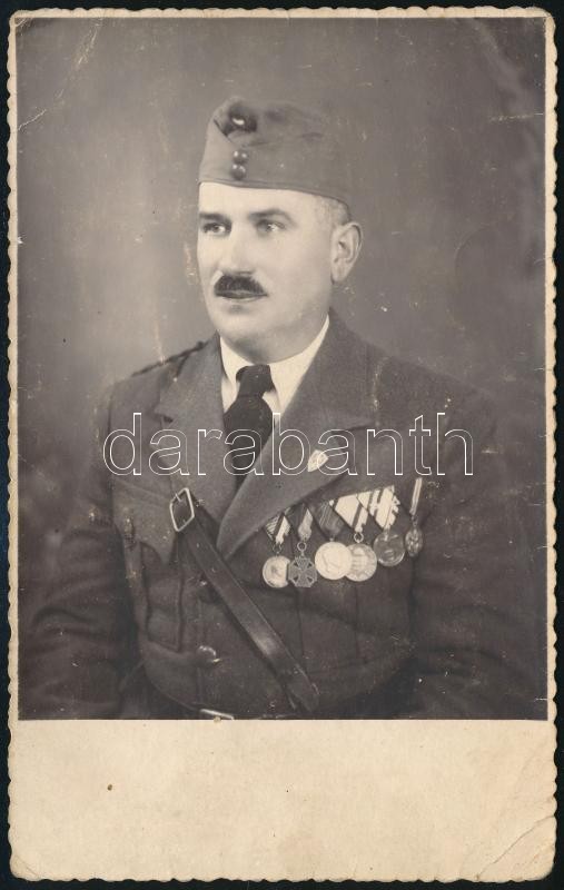 cca 1930-1940 Frontharcos egyenruhás fotója, kitüntetésekkel, bocskai sapkával, fotólap, Beregszász, Ignáczy Géza Fényképész bélyegzéssel a hátoldalán, a sarkán törésnyommal, 13x8 cm