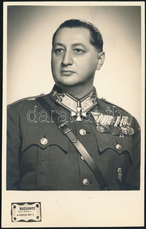 cca 1930-1940 Magyar hadsereg törzstisztjének portréfotója, számos kitüntetéssel, rajta: Magyar Érdemrend középkeresztje, vitézi jelvény...stb, Rozgonyi fotó, fotólap, 13x8 cm