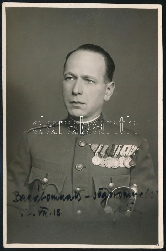 Leírás: cca 1937 Tartalékos hadnagy fotója, kitüntetésekkel, karddal, fotólap, Schäffer Gy. Fotó bélyegzéssel a hátoldalon, 13x8 cm